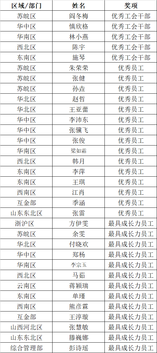 ***后,对各区域自主申请,集体评议,评选出的13名******成长力员工,15名******员工及5名******工会干部进行表彰,并由曹总给各大区工会组长代表颁奖,名单附后。